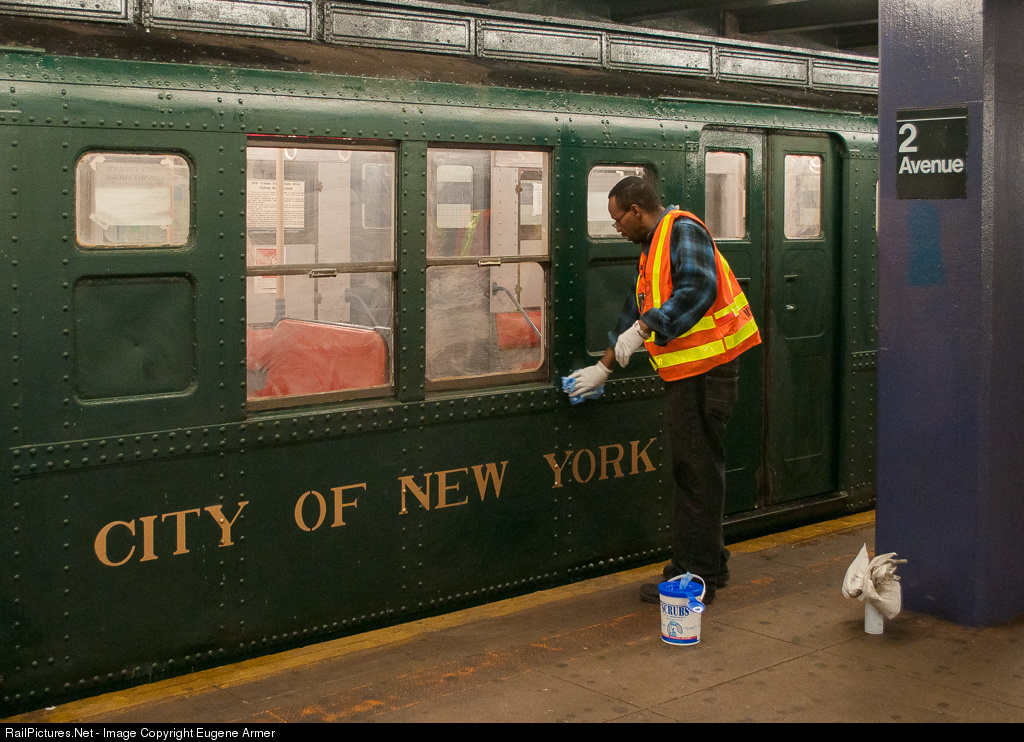 | The New York City Transit Museum operated their "Nostalgic Shoppers Special Train" on Sundays during December 2015, along the Sixth Avenue line, between 2nd Avenue and Queens Plaza stations. One of the classic R1 cars gets some TLC at 2nd Avenue before the first run of the day.