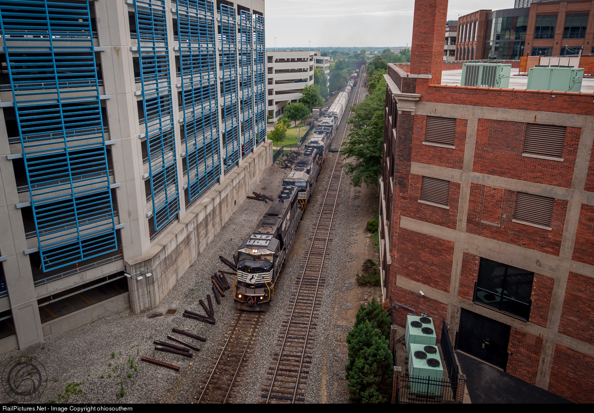 Norfolk Southern 6720 leads a mixed freight through downtown Columbus.