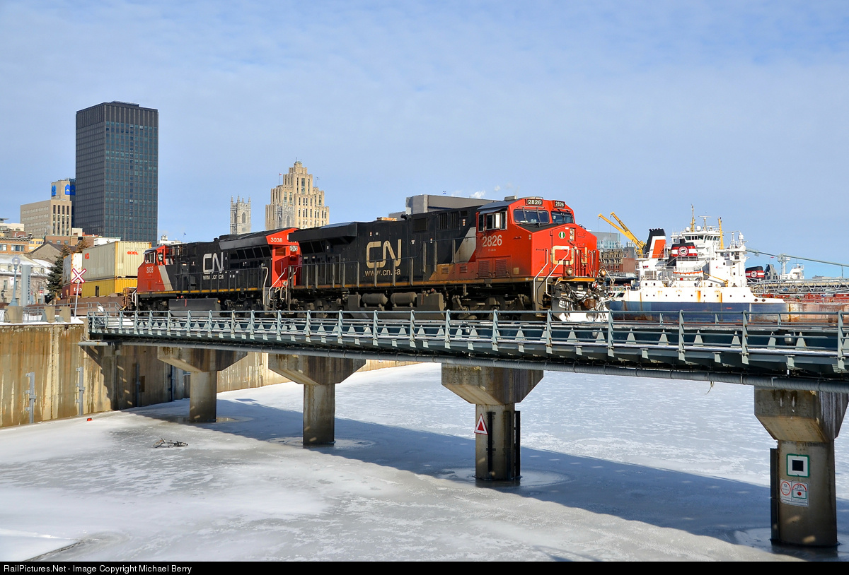 | CN 149 and 3 ship funnels. CN 2826 & CN 3038 lead CN 149 over the frozen entrance to the Lachine canal on a cold but bright morning. In the distance the funnels of three ships are visible, laying over for the winter in Montreal. From closest to furthest, they are the Tim S. Dool, the Baie St-Paul and the Algoma Navigator. |