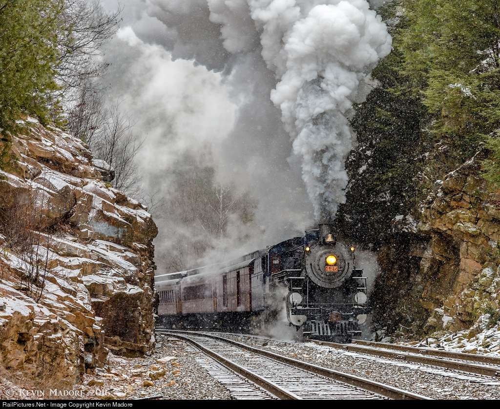 | MM 124.9 - Glen Onoko. A light snow begins to fall in the rock cut at Glen Onoko as the Reading & Northern's Locomotive 425 hustles her express passenger train out of the Lehigh Gorge, toward Jim Thorpe, Pennsylvania. |