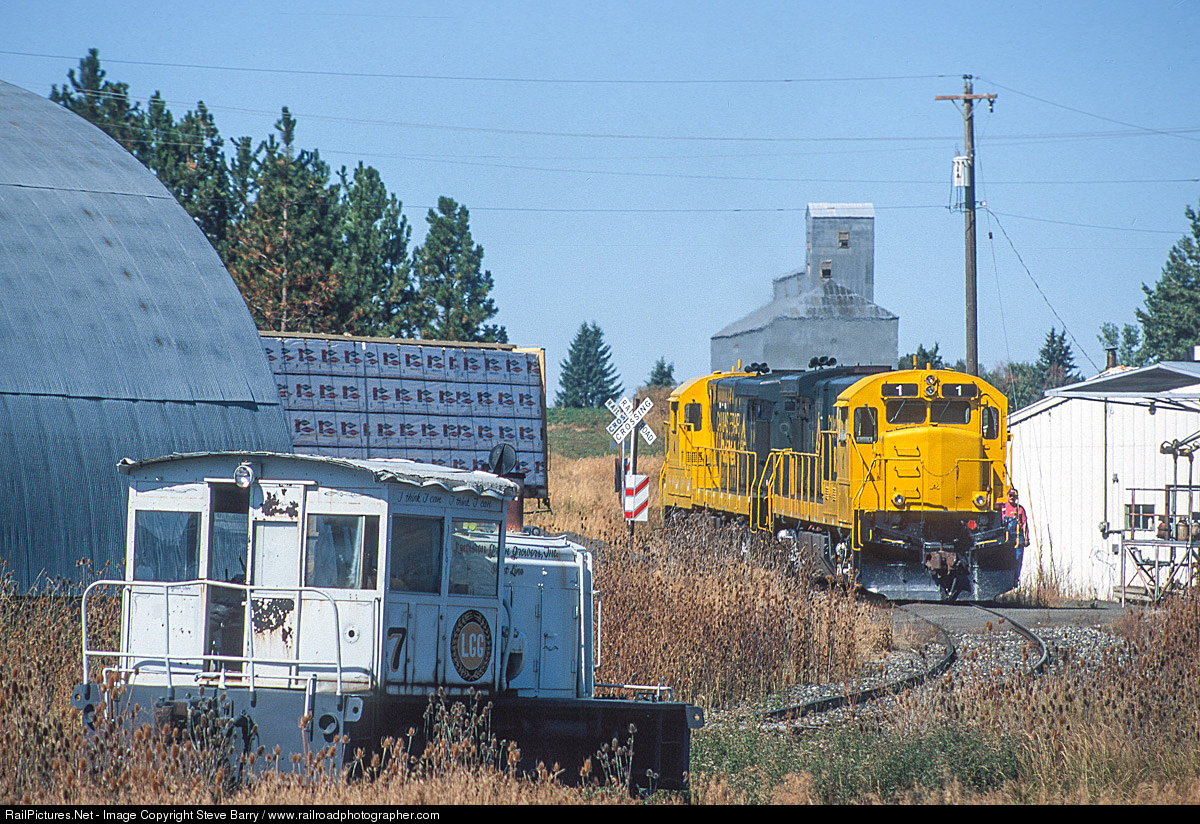 | Camas Prairie RailNet switches in Craigmont, Ida. The unused switcher belongs to Lewiston Grain Growers. |