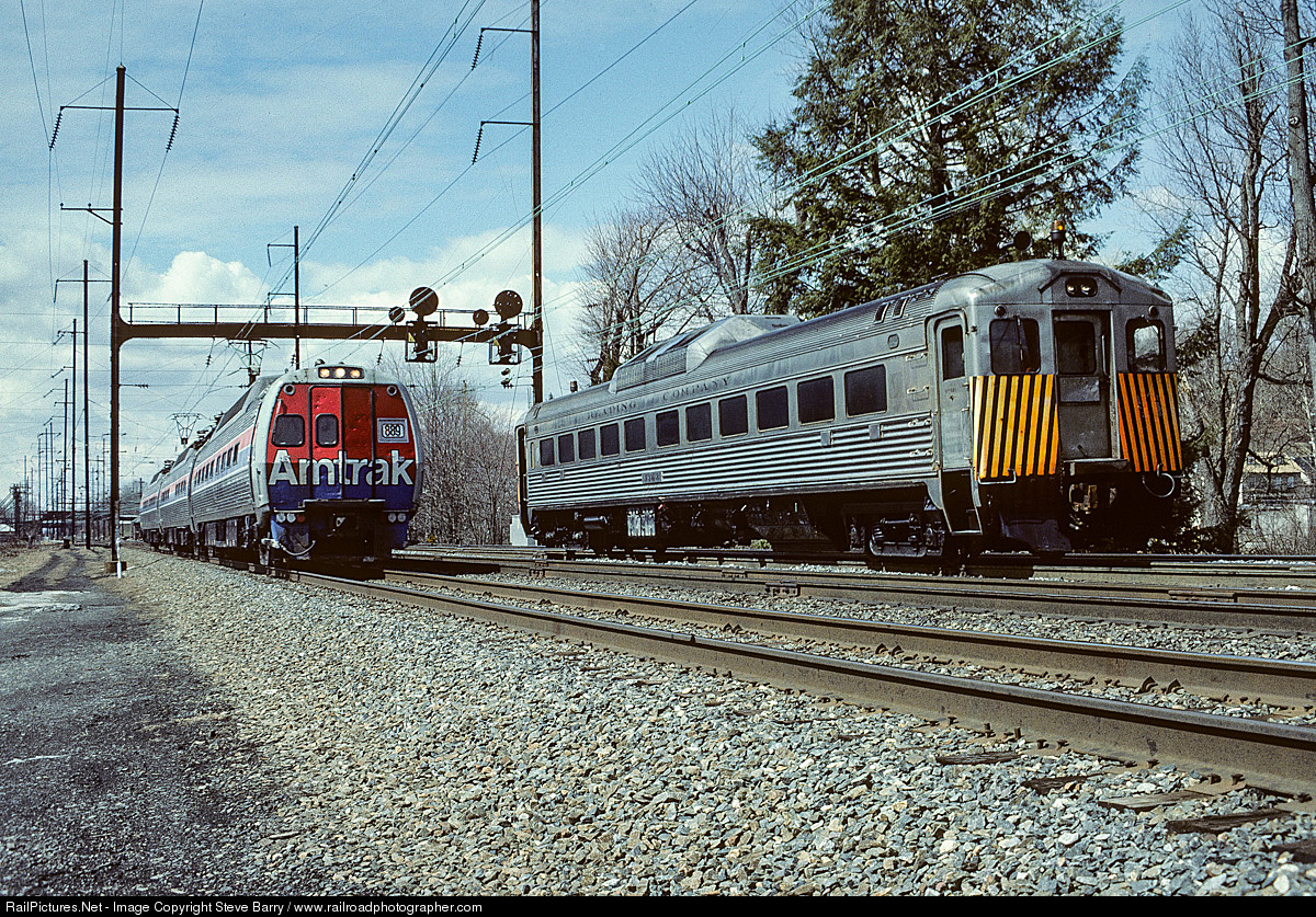 | An Amtrak Metroliner (now in Keystone service) meets Reading (SEPTA) RDC No. 9163 in Parkesburg, Pa. The RDC is heading for the Railroad Museum of Pennsylvania in Strasburg to be restored as Lehigh Valley No. 40. The Budd car made it this far under its own power, but glided to a stop at the signal here with a mechanical issue. An Amtrak work locomotive would be dispatched to tow it the rest of the way to Strasburg. |