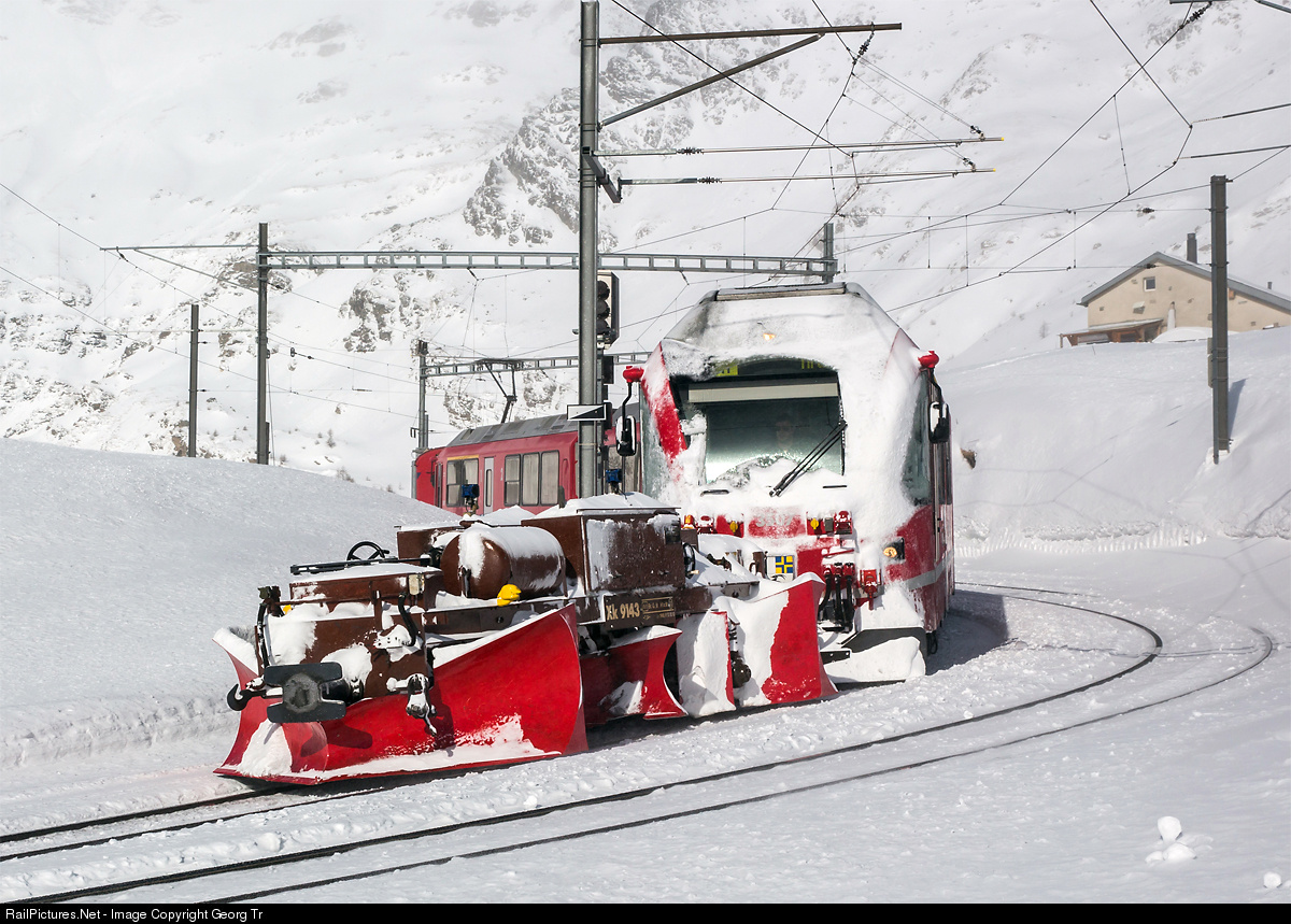 | "Allegra" ABe 8/12 # 3507 with flanger (spur plow) Xk # 9143 is leaving Alp Grüm with train 1617 to Tirano. From Alp Grüm onwards, the flanger isn't operated anymore (less snow), the lights are switched off and the cable to the railcar for power is disconnected. |