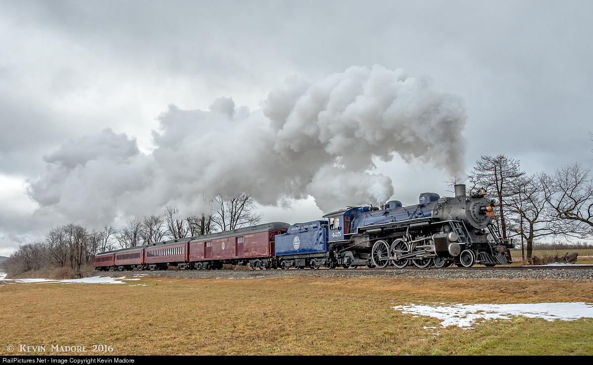Images from charters and regular operations depicting the Reading & Northern's two steam locomotives, the 4-8-4 Northern #2102 and the 4-6-2 Pacific #425.