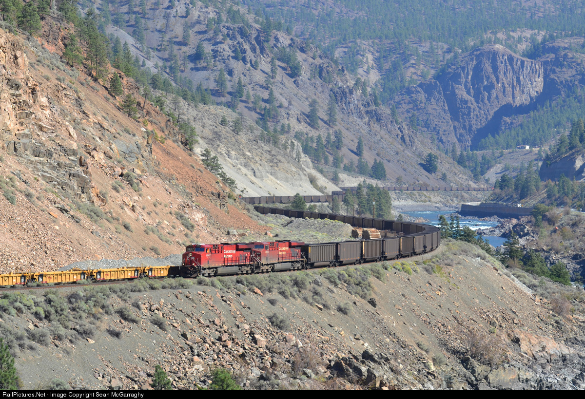 The winding track that follows the Thompson River near Lytton is nicely illustrated here as Canadian Pacific locomotives 8947 & 8799 pull a southwest bound loaded coal train. Fellow ES44AC unit 8736 is in DPU mode in the middle of the train, while GE AC4400CW unit 8647 pushes from the rear.