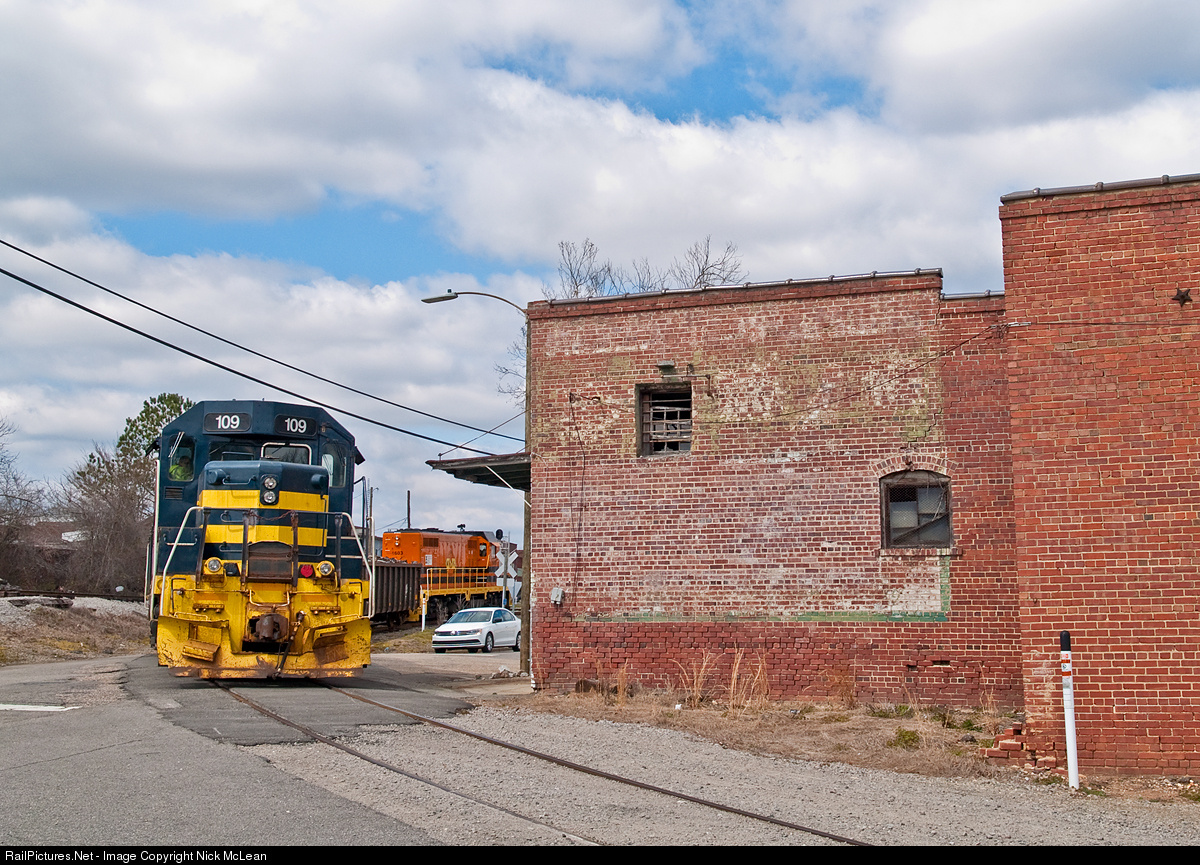 | It's around noon and 109 has been shut down for the day. She is along for the ride as 1603 pulls the short train around a tight curve and back to the small yard in downtown Sanford where they will finish some switching and tie up. |