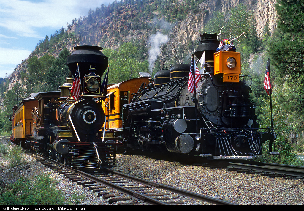 Eureka and Palisades No. 4 passes the Durango and Silverton Narrow Gauge Railroad’s “Presidential Special” powered by K-28 No. 473 at Tacoma, Colorado, on August 23, 2003. Built by Alco in 1923, No. 473 is dressed up in 1950s movie paint for the occasion—while wood-burning 4-4-0 “Eureka,” complete with brass fittings and walnut cab, has its as-built by Baldwin in 1875 look after a lovingly restoration by Dan Markoff. Both make a colorful sight marching up the Animas Canyon on 3-foot rails of the D&SNG during Railfest 2003.