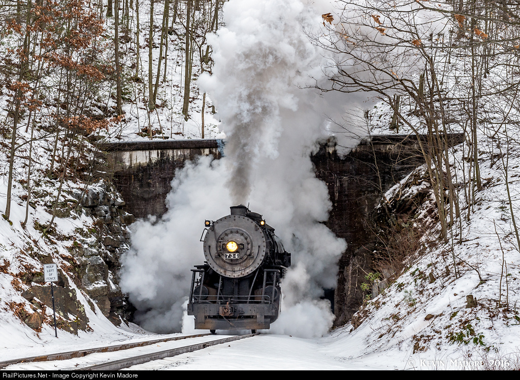 Keep left of Fence: Brush Tunnel Westbound. It's a small sign, but a serious warning. The 914 ft. long Brush Tunnel is the one place on the Great Allegheny Passage Rail Trail where the trains and the pedestrians don't co-exist very well at all. The Western Maryland Scenic Railroad's big Consolidation #734 is a stoker-equipped, fire-breathing monster, and when she's on the westbound run, as seen here, she belches enormous amounts of black smoke and cinders. Woe to anyone who happens to be in Brush Tunnel when she makes her entrance. Not only do they risk being burned by hot cinders, but it can be downright difficult to just breathe. The acrid exhaust gasses and steam often persist for several minutes after she's gone. There's also another issue that's not so obvious to the walkers and bikers....tell me if you think the 734's engineer and fireman can actually see anything ahead of them! Being on the wrong side of the steel fence will probably not be good for one's continued good health. Fortunately, they don't call her "Mountain Thunder" for nothing. You can usually hear the train pounding up the hill and blowing for the crossings as she does. If folks would just shut off their IPODs and cell phones, its pretty easy to avoid having a close encounter with a fire-breathing monster in the darkness under Piney Mountain.
