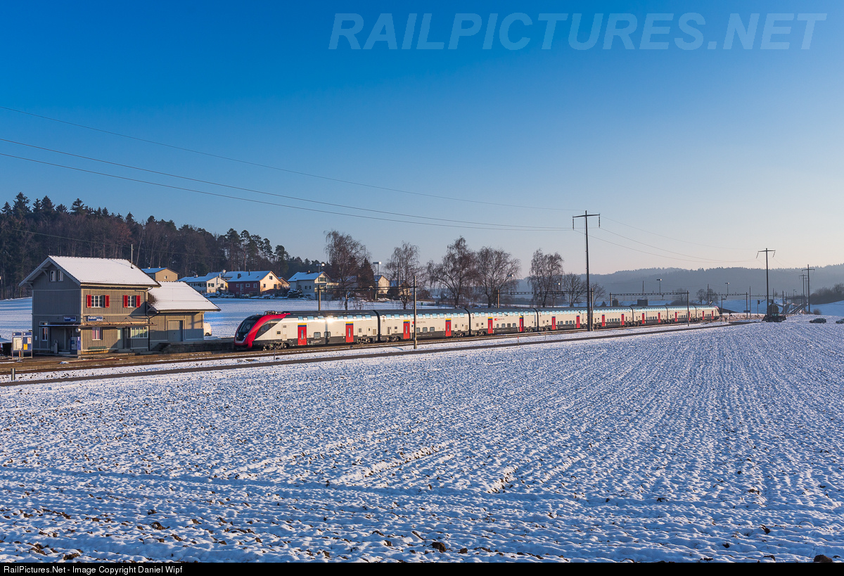 | Soon, brand new RABe 502 will be delivered from Bombardier to SBB. Train 203 was for a testrun on the secondary line between Seuzach and Ossingen at this January evening. |