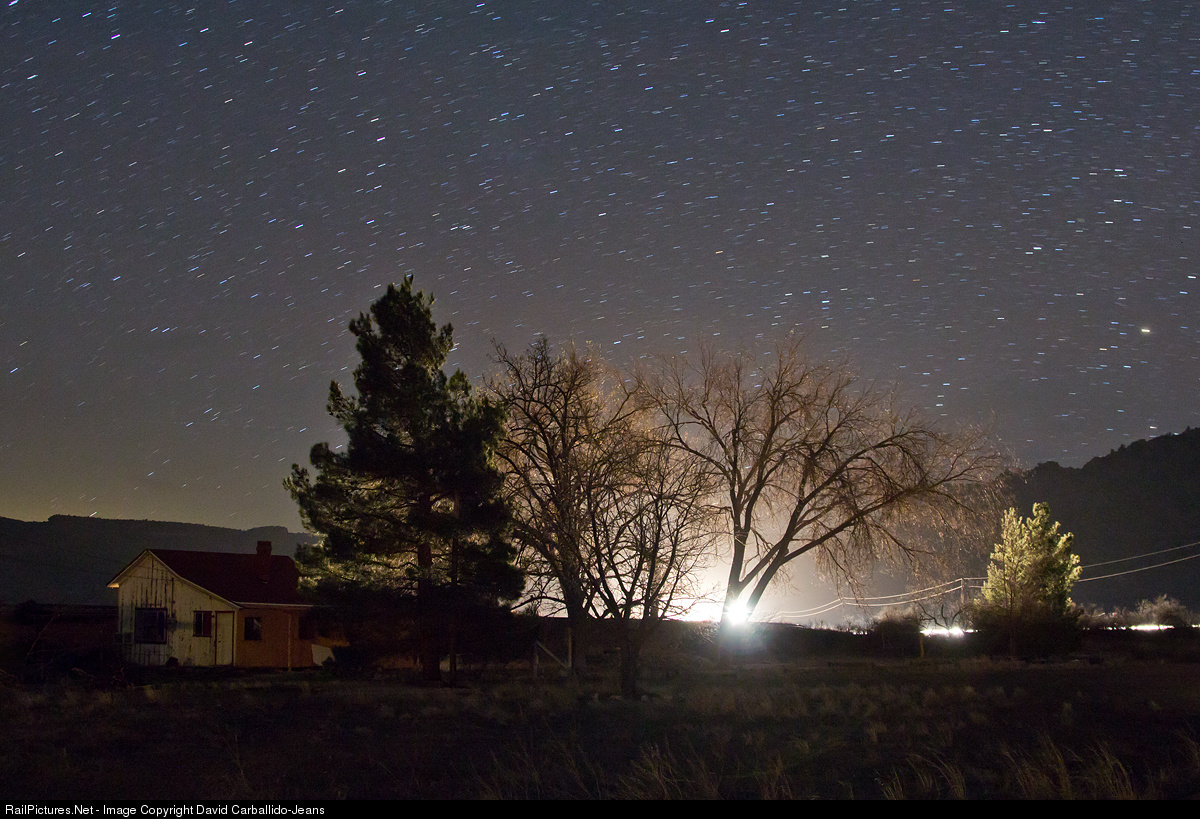 With the smell of smoke exiting our chimney fills the air, I set up in our front yard for an eastbound train; wherever it may be. The temperature was hovering around 45 degrees that night, so I sat in the warm car listening to the radio. After about forty minutes, I heard the sound of a train horn honking for the pair of crossings in Valentine that were about three miles to the west of me. A few minutes later, the glow from the headlights being to shone through the tree branches surround the former ATSF Crozier train station. By now, the sound of the three General Electric locomotives reaches full volume as they pull their string of empty grain cars into Crozier Canyon. With the moon at Crescent Phase, the stars really shine in the 80 second exposure