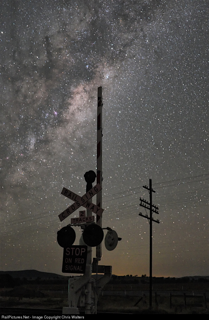 The Milky Way looms over a deserted highway level crossing near Illabo, not far from Junee, in south-western NSW.