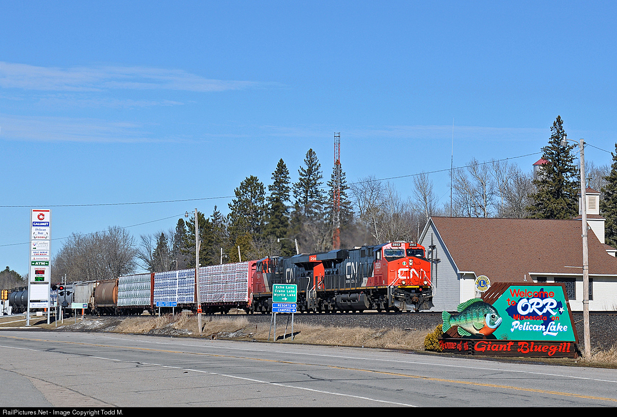 | CN 2853 comes screaming around the bend at track speed with it's mixed freight train in tow and passes through the small town of Orr, MN (pop 267 or so) along the CN Rainy Sub. In the summer months this small community grows with tourists both vacationing and fishing. |
