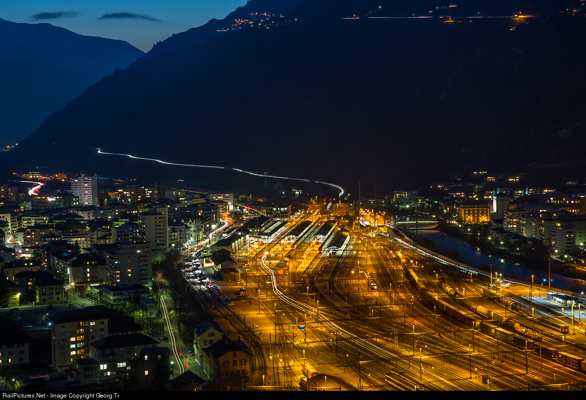 View of Brig, transport hub in the Upper Valais, at night, with the passenger station (left) and the freight yard (right). From the Lötschberg mountain route, the "Lötschberger" RegioExpress 4281 from Berne winds along the hillside down to the station. From track 1 leaves a ETR 610 of the SBB as Euro City 36 from Milan to Geneva towards Visp. On track 4 and 7 are Intercity trains of SBB visible. In the foreground, the light traces of a train can be seen, which is being put away in the sidings from track 3. Right of the railway tracks, the Rhone or the Rotten, as the river is called in the German speaking upper Valais, and on the other side of the river the city Naters. Up on the hillside are the lights of Mund and Birgisch villages.
