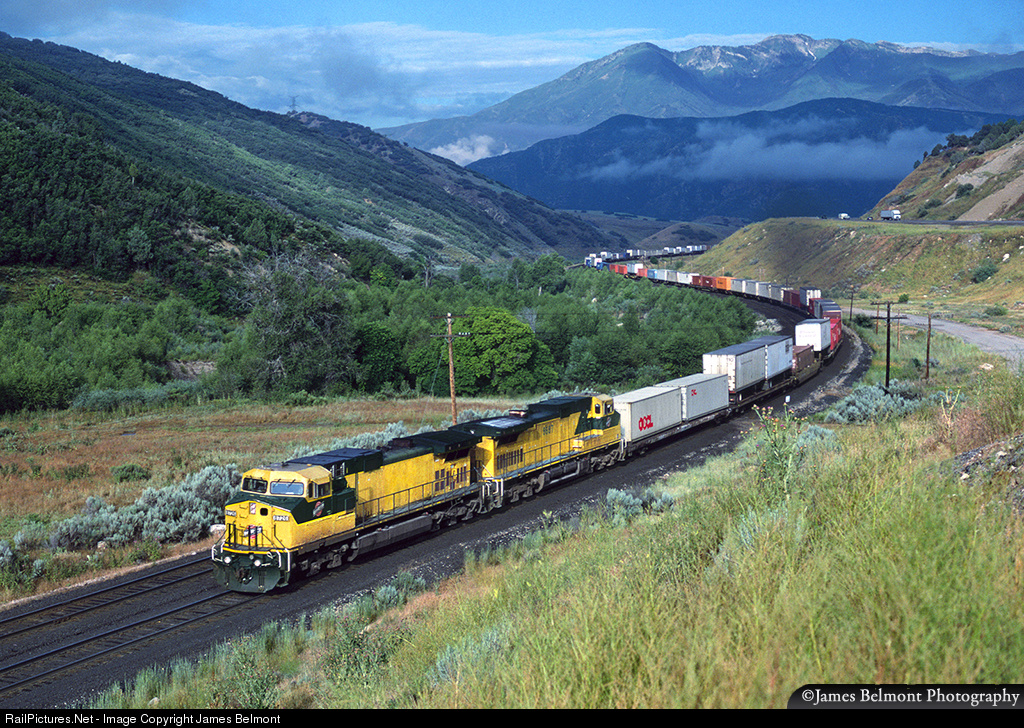 With a pair of CNW C44-9W motors for power, Union Pacific's Los Angeles to Denver expedited intermodal makes a rare appearance on the former Denver & Rio Grande Western through Spanish Fork Canyon on July 24, 1998.