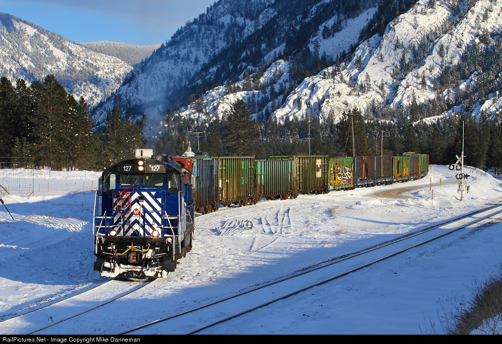 Montana Rail Link’s Paradise Local backs up the Thompson River Lumber Lead at Woodlin near Thompson Falls, Montana, on a cold, crisp February 7, 2014. Recently repainted EMD GP9 No. 127 leads the train which will switch three customers on the spur.