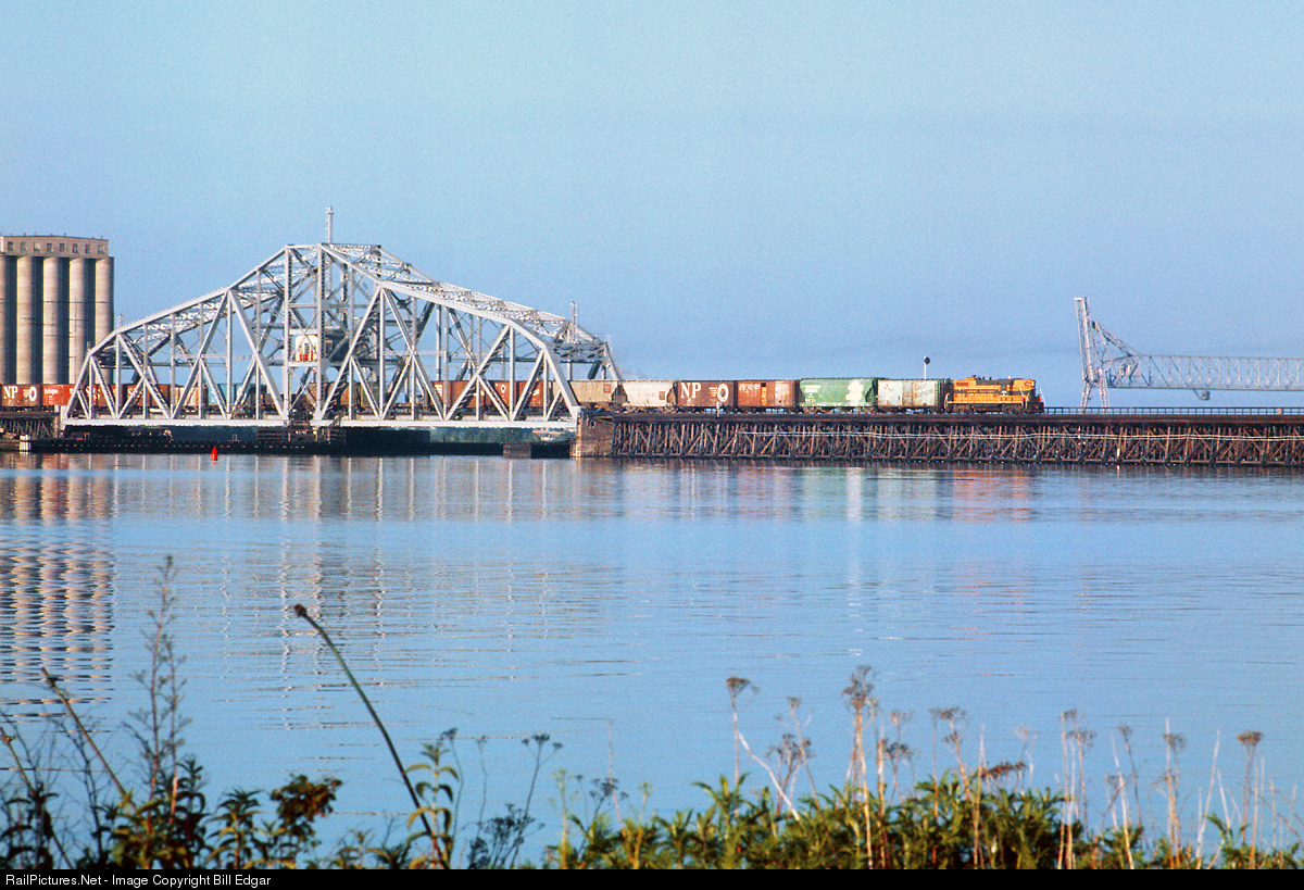 About 545 AM, BN 1540 a former GN GP7 drags a transfer from Superior, WI across the Wisconsin draw on its way into Duluth, MN. This shot was obtained as a result of camping out the previous evening in my Chevy station wagon which broke down at this location. I was able to grab this shot while my friend repaired our water hose with duct tape.