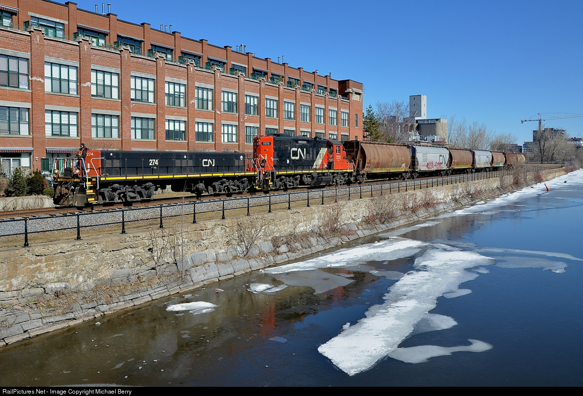 | Passing the old Stelco mill. Slug CN 274 and GP9 CN 7272 have left the Robin Hood mill with 7 empties as they head west along East Side Canal Bank Spur. Once a common sight along both sides of the Lachine Canal, trains are now very rare, with Robin Hood mill being the only rail-served client along the length of the entire canal. The train is passing what was part of the Stelco steel mill; now it is part of a condo complex. |