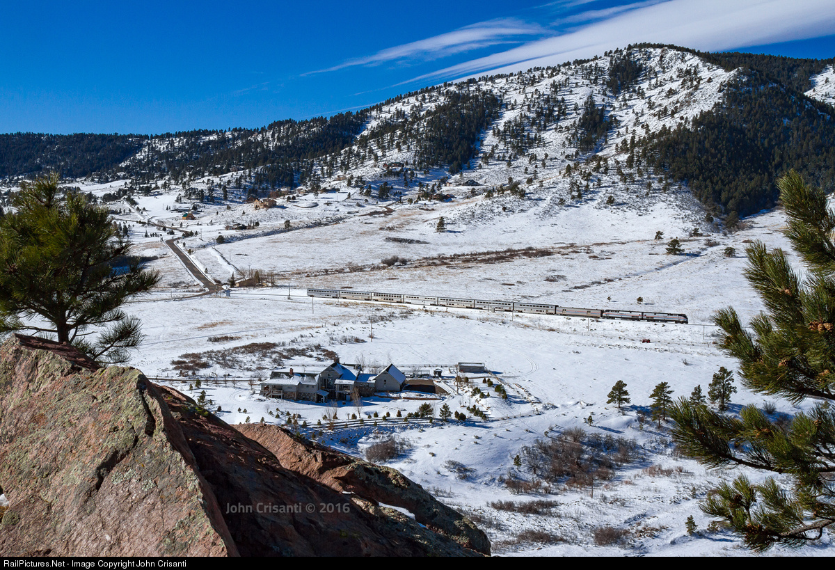 | AMTK P40DC No. 822 and P42DC No. 145 both painted in the Phase III scheme lead Amtrak's westbound "California Zephyr" through the eastern rim of Coal Creek Canyon. The train has just crossed over Blue Mountain Road and is currently going over the defect detector while climbing the 2-percent grade on February 24, 2016. |