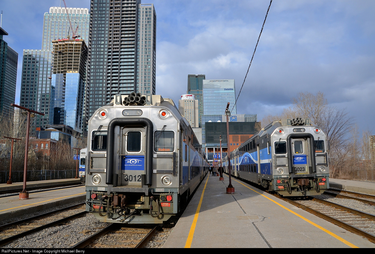 | Bound for Hudson and Vaudreuil. Two Vaudreuil-Hudson AMT trains are boarding passengers at Lucien L'Allier station during the evening rush hour in downtown Montreal. AMT 111 at left will go all the way to Hudson (the only train to go that far all day) while AMT 25 at right will go to Vaudreuil. |
