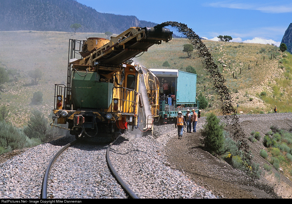 A Union Pacific undercutter works in a curve after the passage of a TRT (Track Replacement Train) east of Radium, Colorado on August 5, 2009. UP No. 902051 is a Plasser & Theurer RM80 undercutter that specializes in cleaning ballast. Over time, ballast can break down, and other impurities like sand and dirt can further create drainage problems in the track structure. This machine excavates under the track to various depths, with a series of conveyers taking the “dirty” ballast through screens, sorting out the fines and contaminants from good ballast, and depositing the “cleaned” ballast back onto the track. The waste materials are discharged using conveyors that deposit the material to either side of the right-of-way, or into open-top railcars.