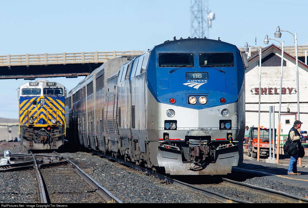 | Amtrak's Empire Builder is well ahead of schedule stopped at the station in Shelby, MT about 20 minutes early... much to the dismay of the crew on CREX 1327 east who has to wait for their departure. |
