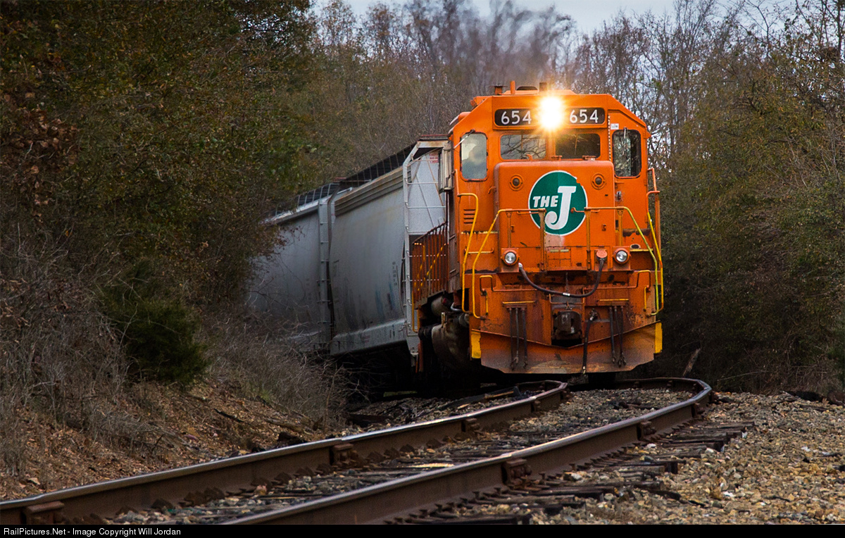 Hartwell Railroad's Bowersville local pulls into Bowersville with former EJ&E SD38 654 leading two hoppers bound for the Rose Acre Feed Mill, which stands behind the camera in this view.