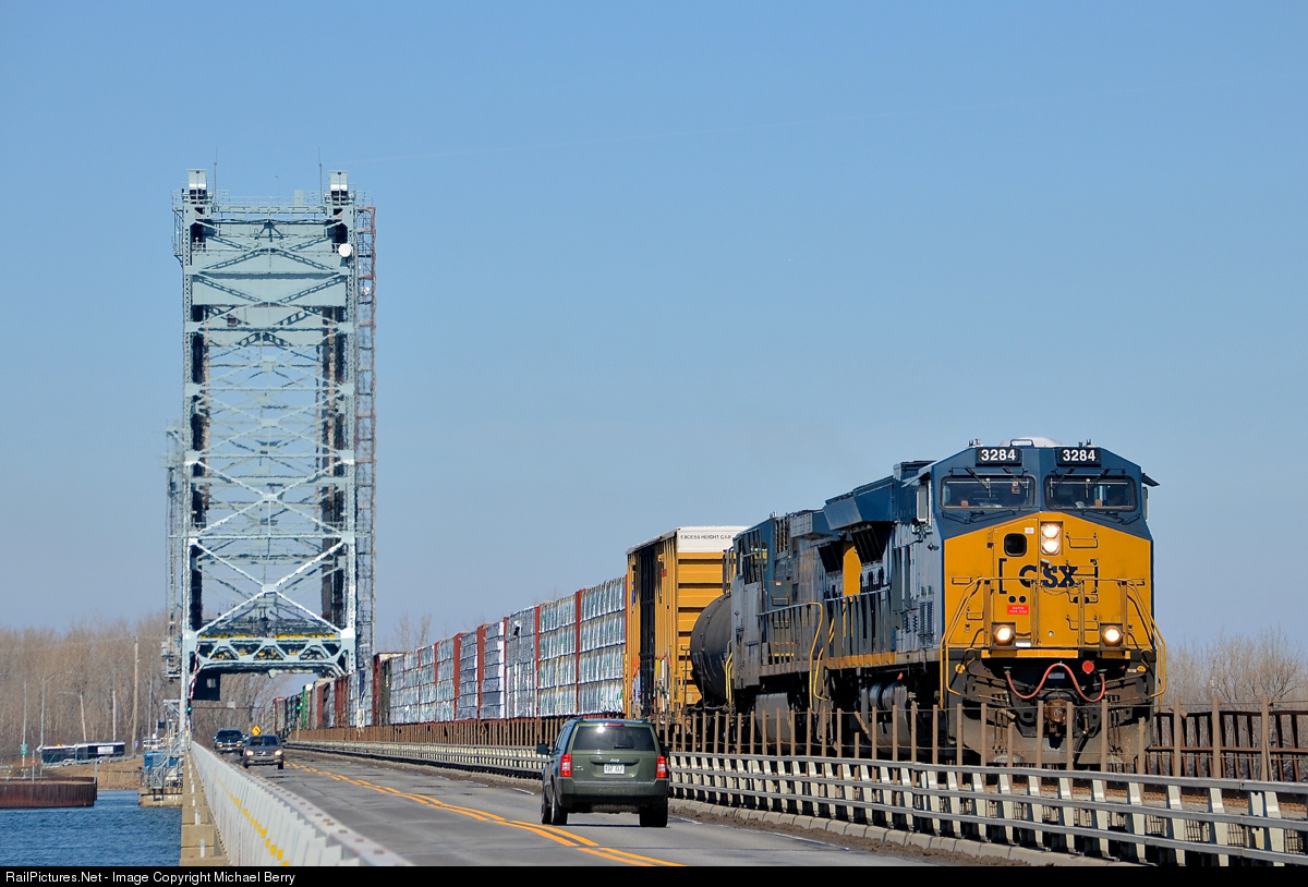 | Sharing the bridge with road traffic. The Larcoque bridge over the Beauharnois canal has 2 lanes for road traffic, as well as a single track for CSXT's Montreal sub. Here CN 327 is crossing over the bridge with new unit CSXT 3284 leading. Trailing is CSXT 5101. |