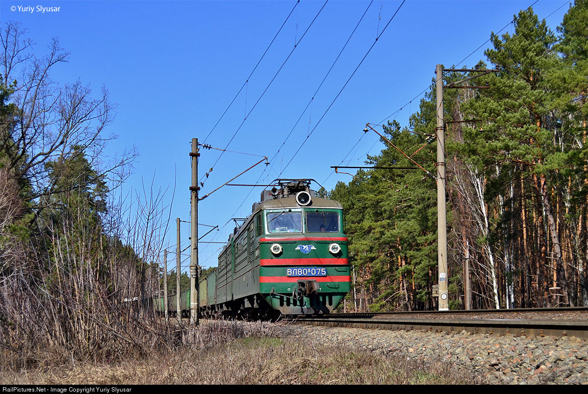 | The freight electric locomotive VL80K-075 (depot TCH-3 Kozyatyn (Pivdenno-Zakhidna Zaliznytsya / South-Western Railway; built by NEVZ in November, 1966) going from freight station Darnytsya to bigining of railway branch Kyiv - Grebinka (part of railway line Kyiv - Kharkiv). |