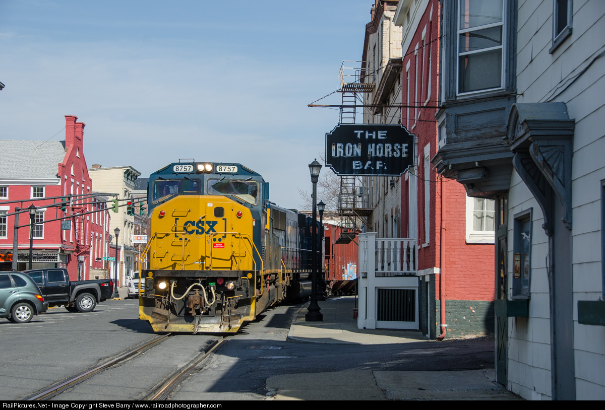 | A CSX train returns from the ADM plant in Hudson, N.Y., running down 7th Street for a block past the Iron Horse Bar. |