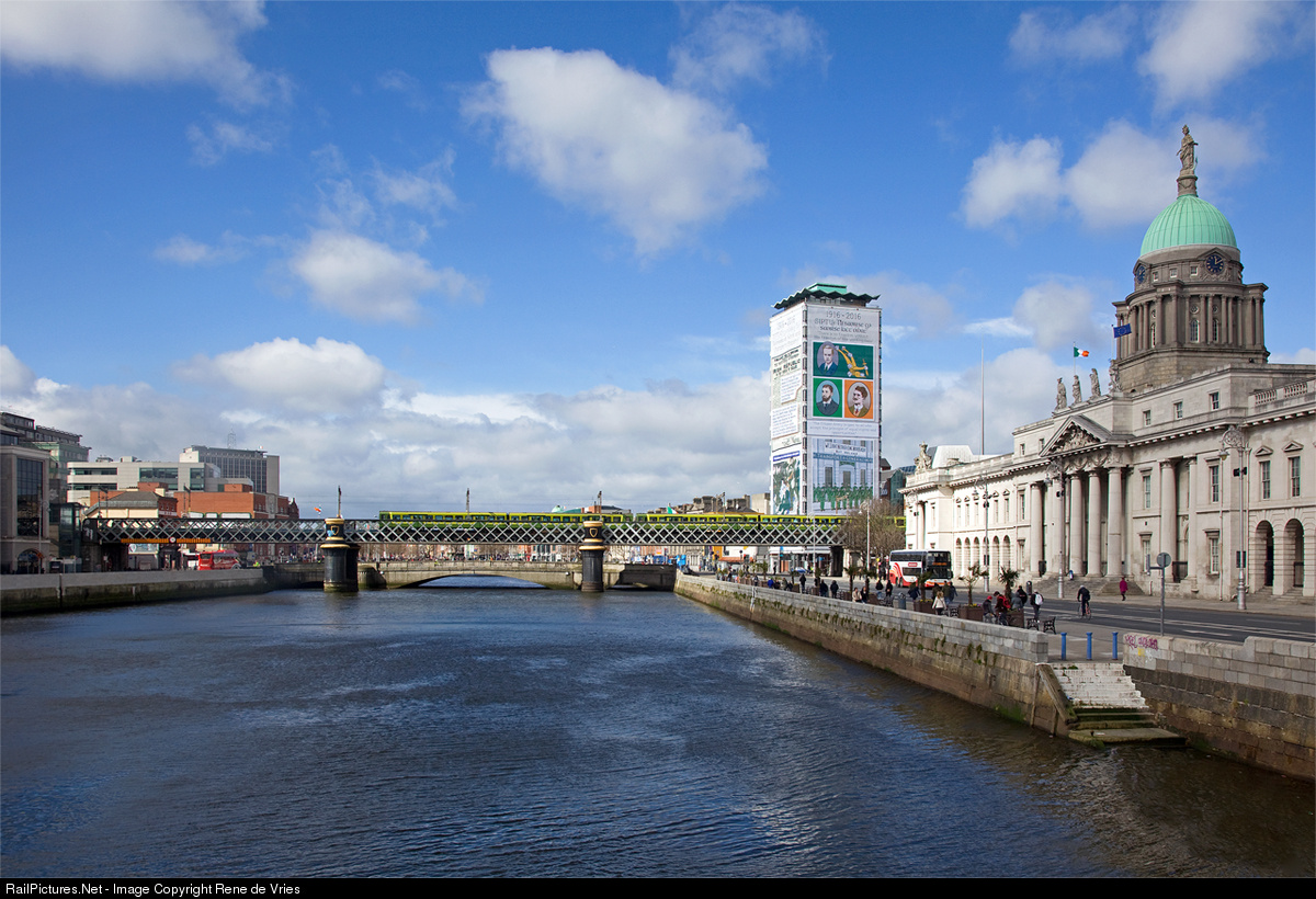 "Ni saoirse gan saoirse na lucht oibre" or in English: "there is no freedom when there is no freedom for the working class". Three D.A.R.T. railcars pass the river Liffey and the union building which commemorates the lockout of 1913.