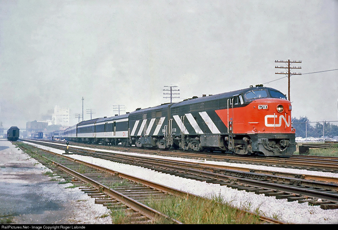 CN C-Liner number 6700 and MLW FPB-4 6854 with early morning Toronto bound train in September, 1967. Six model CPA16-5 and six corresponding B units were built by Canadian Locomotive Company, under licence from Fairbanks Morse in Kingston, Ontario.