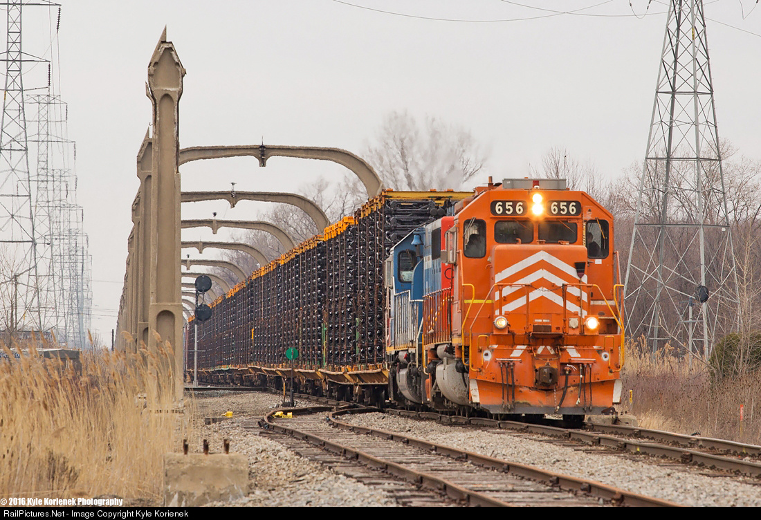 Despite the heavy clouds hanging strong thanks to the Detroit River, the sky did not dampen the mood of myself, Steven McKay and "The Guy"(along with several others) as CN L572, led by EJ&E 656 and GTW 5936, rolls south along the CN Dearborn Sub under the arches that Henry Ford built to power his trains. The electrification is long gone, but the Ford business is bigger than ever, as evidence by the dozens of auto frames rocking along down the jointed rail.