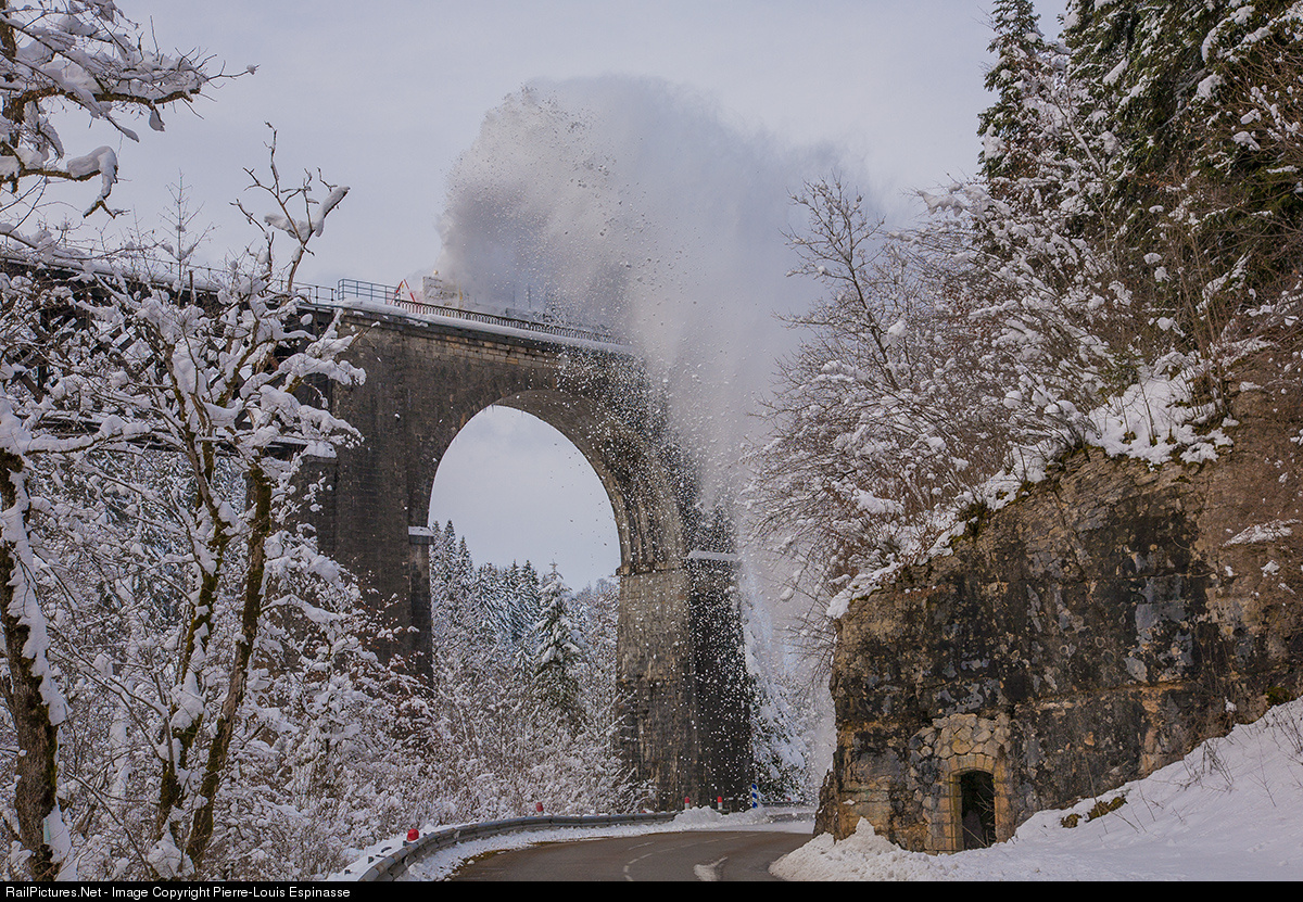 The SNCF Beilhack rotary snowplow clears the line between Andelot and Morez. Better worth not driving at the same time under the Syam viaduct!