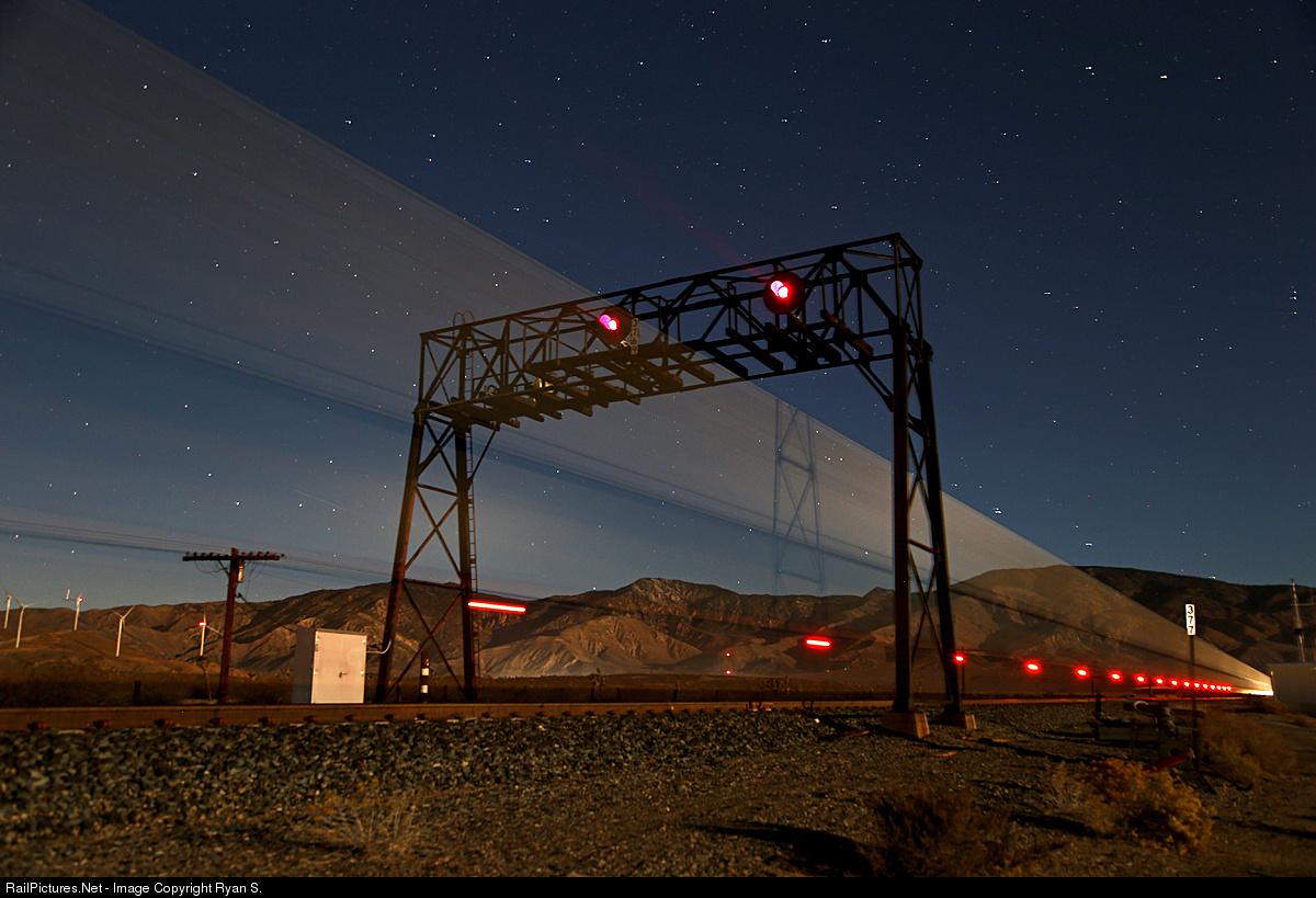 A trademark of Tehachapi's eastern slope, the old Southern Pacific era iron frame signal bridge at MP 377 frames a westbound BNSF double stack train as it crawls out of the desert and into the Tehachapi mountains. 10 days after this image was recorded the old signal bridge was retired and removed, thus bringing to an end the US&S searchlight signal era on Tehachapi.