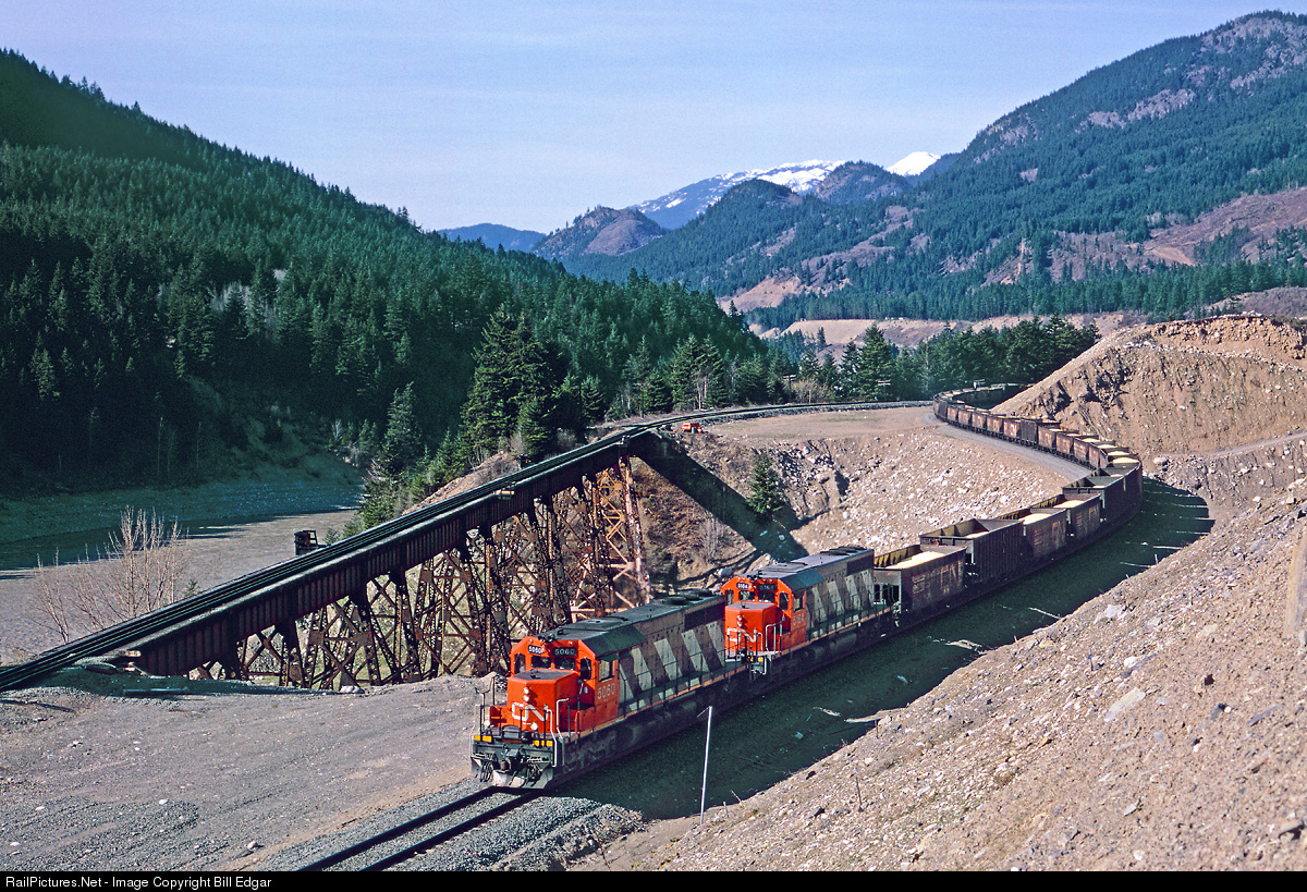CN 5060 and another SD40 are enough power to handle a loaded sulfur train down the Fraser Canyon. The train is bypassing the Stoyoma Creek trestle on newly installed trackage that increased capacity for CN for trains arriving at Boston Bar from the east. The old line remained in service.