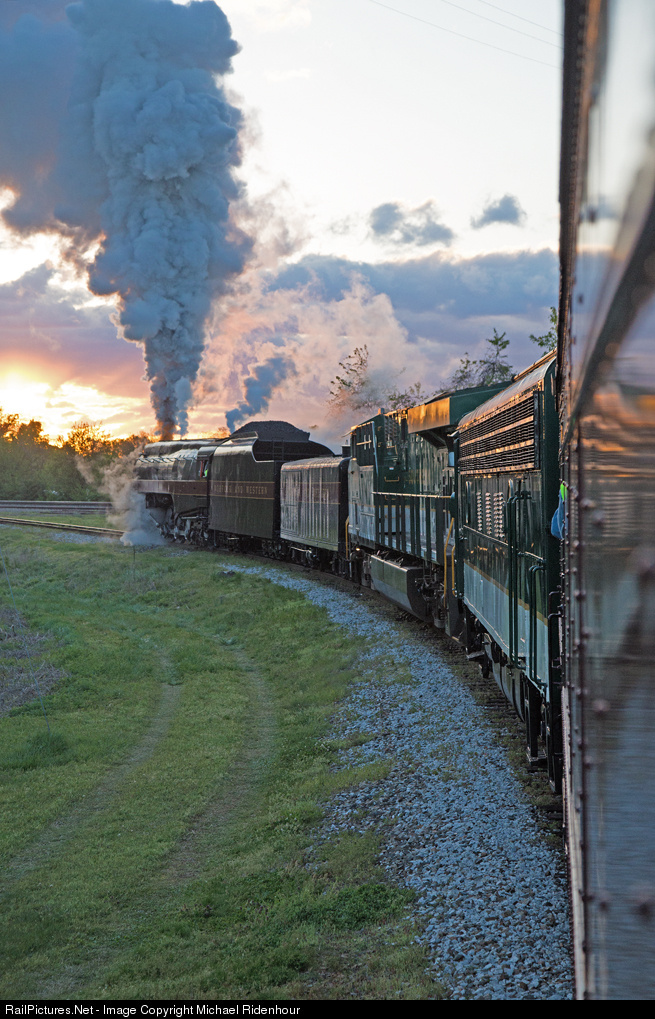 Norfolk Southern Heritage unit 8099 and Southern FP7 6133 lend a helping hand to N&W Class J 4-8-4 611 leaving the North Carolina Transportation Museum in Spencer NC on a roundtrip excursion to Lynchburg VA