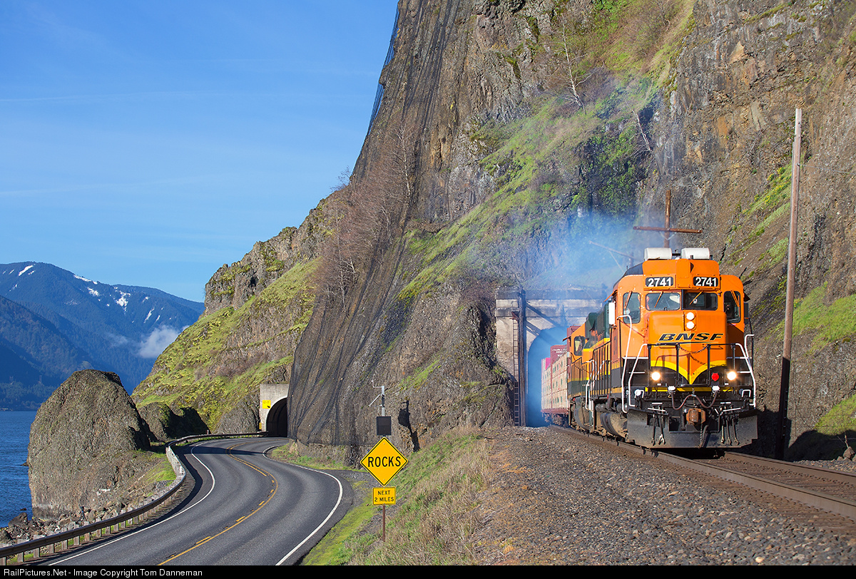 BNSF eastbound local R-NWE8451-17 blasts out of a tunnel in the Columbia River Gorge east of Cooks, Washington, on a gorgeous day. BNSF GP39E 2741 (former CB&Q rebuilt GP30) leads the train.