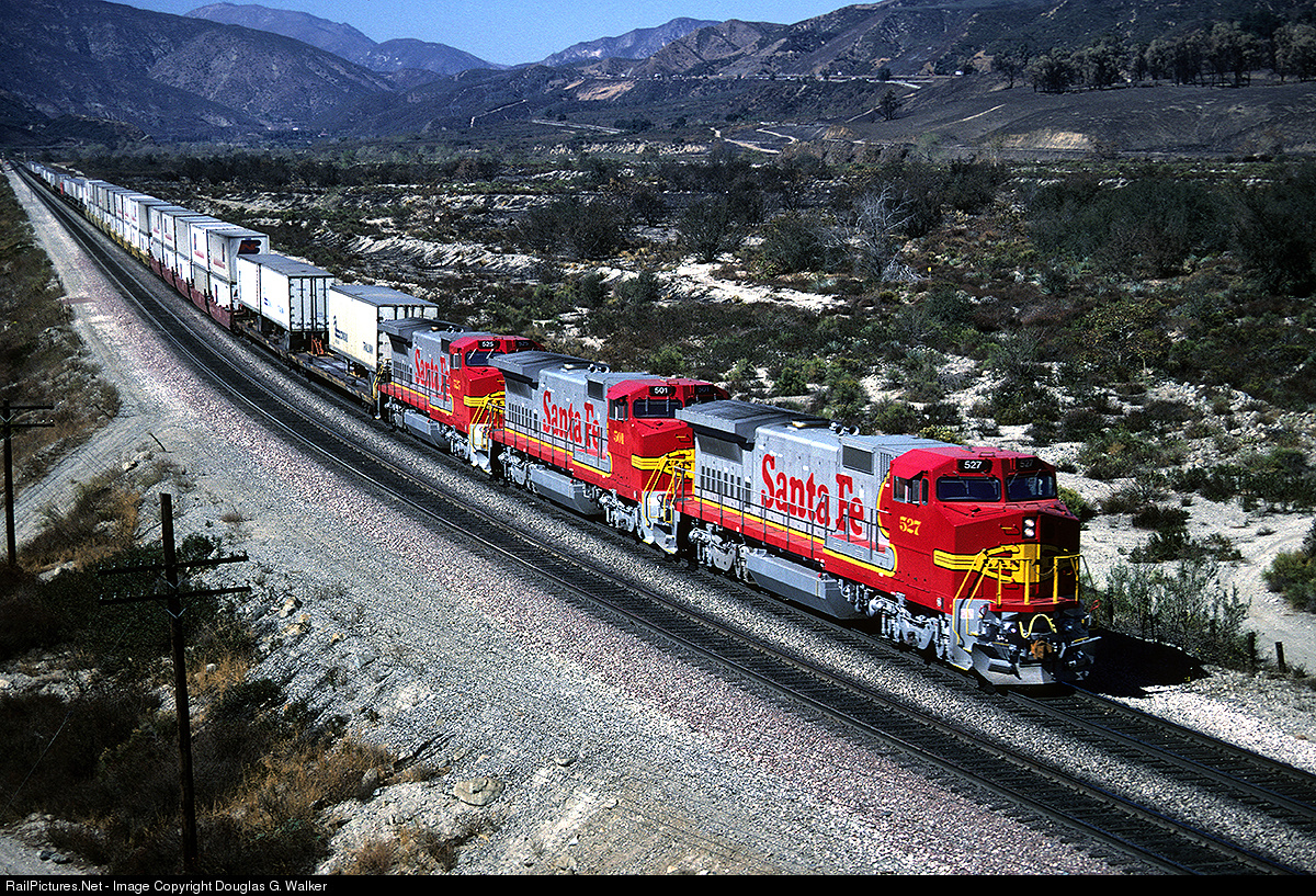 A hot Santa Fe westbound intermodal train approaches Devore, at the base of southern California's Cajon Pass, on October 27th, 1990. The train is being pulled by three new "elephant-style" Dash 8-40BWs: 527, 501 and 525.