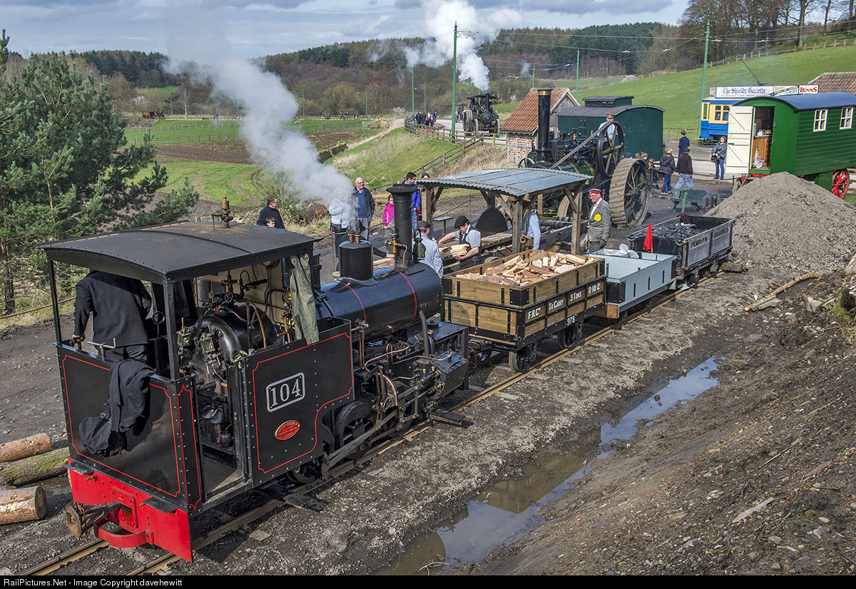 Another area of the narrow gauge which has been recently opened. Here guest engine 104 is at the head of a train carrying sawn wood. The traction engine has been harnessed to drive a belt which in turn drives the saw. Logs are reduced to planks which will be used around the site for construction. Chips will be used for fires in the houses in winter time. In the spirit of the World War 1 theme the work is overseen by soldiers, the work itself is done by "prisoners of war", indicated by a yellow spot on the clothing.