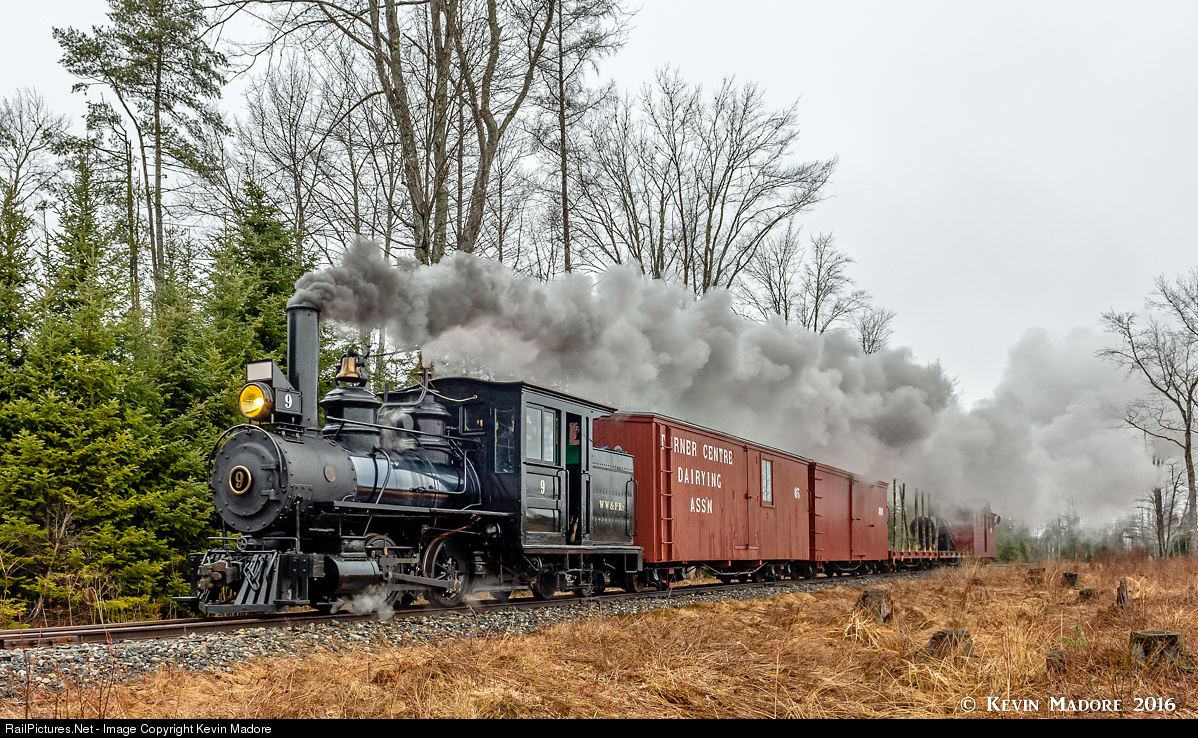 Classic 2-Foot Freight. WW&F Locomotive #9 displays the classic lines of a Maine 2-Foot Forney as she races south toward the tiny flag stop in Alna Center, just over 6 miles from her eventual destination at the seacoast town of Wiscasset. The 18-Ton Number 9 was built in 1891 by Maine's Portland Company, the 622nd steam locomotive to emerge from the erecting shops on the Portland waterfront. She was also one of only ten 2-foot gauge locomotives to be built in Portland. Of the 5 surviving Maine 2-foot locomotives, she's the only one built before 1900 and arguably the prettiest of the group.