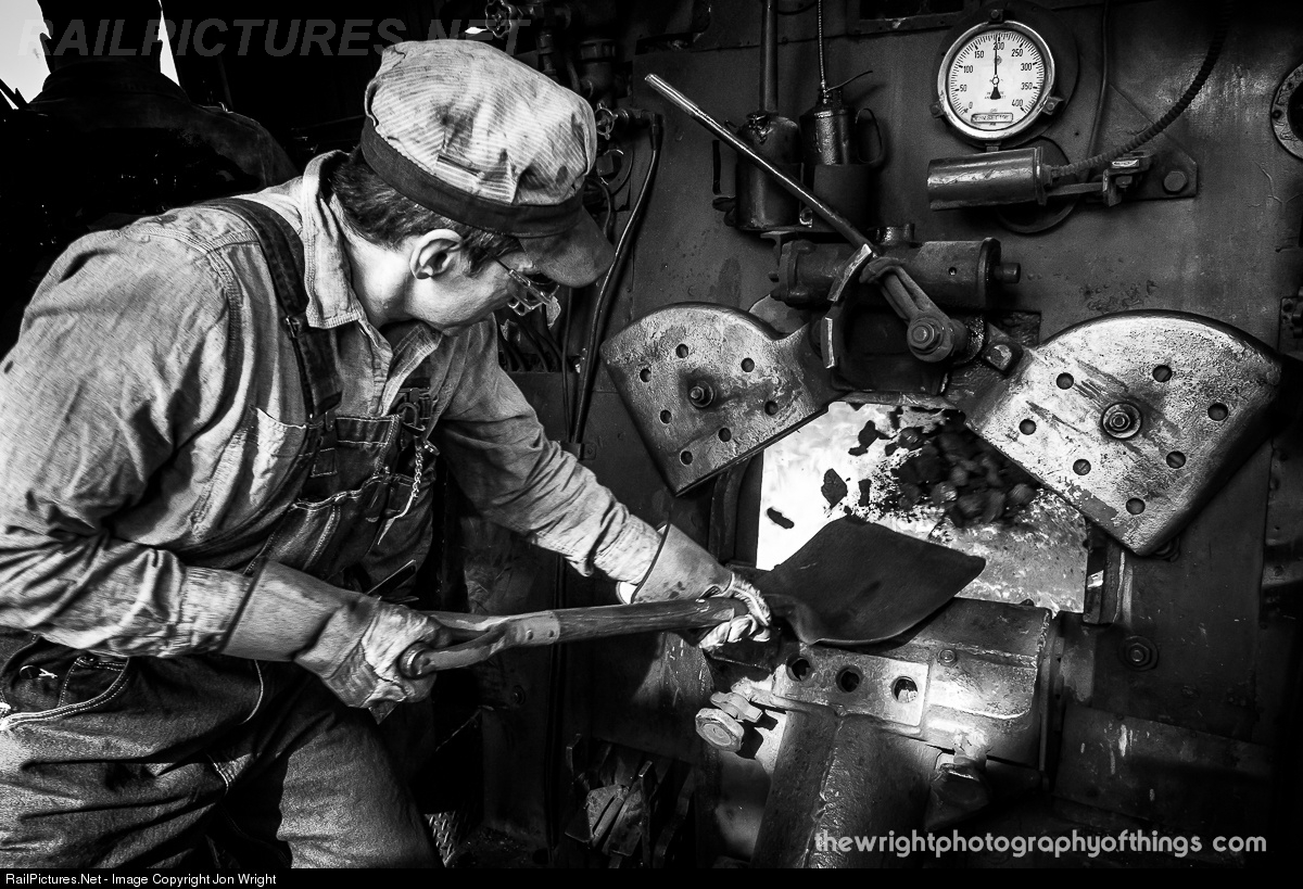 Fireman Richard Butterworth slings a shovelful of coal into the hot belly of Baldwin 2-8-0 WMSR 734 between the Narrows and Helmstetter's Curve