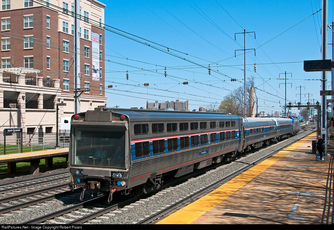 An Amtrak Chief Engineer's Inspection extra passes through North Elizabeth on a run north/east from Washington, DC to Boston. The consist includes three unique pieces of Amtrak equipment behind ACS-64 633: Catenary Measurement car #10005, "Corridor Clipper" #10002 and inspection car "American View" #10004. |