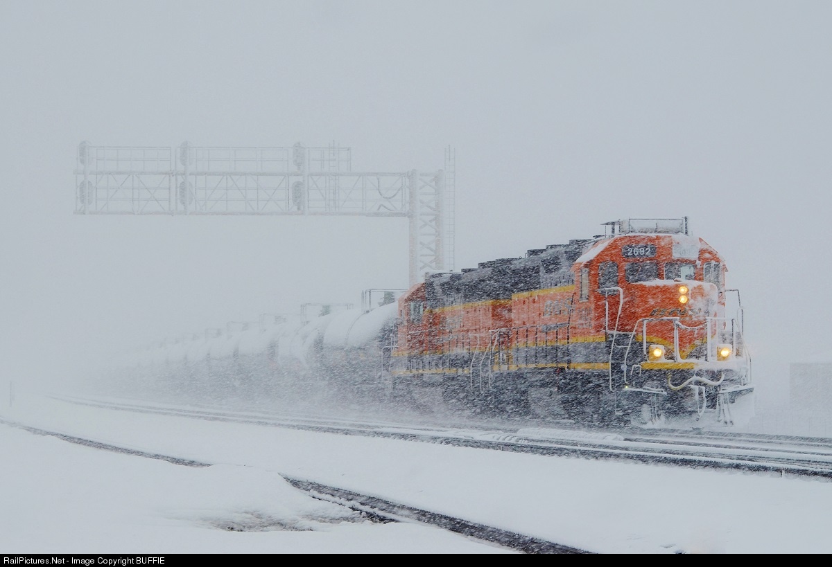 | BNSF 2692 (GP39-3) takes spring blizzard Selene head-on as it passes under the signals on the Brush Sub. The trip to take a string of oil cans to Commerce City will be slow going, with extra care taken at switches and road crossings. |