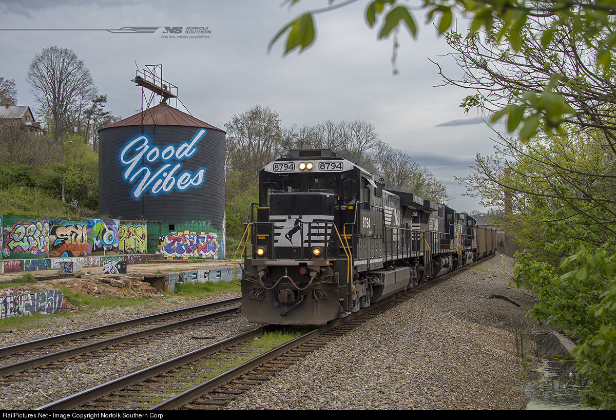 | GE D9-40C number 8794 leads an empty Catawba River coal train west out of Asheville, North Carolina, passing an old grain silo-turned canvas in an art deco region of town near control point "Russell". Photo by Casey Thomason. For more information about Norfolk Southern, visit www.nscorp.com |