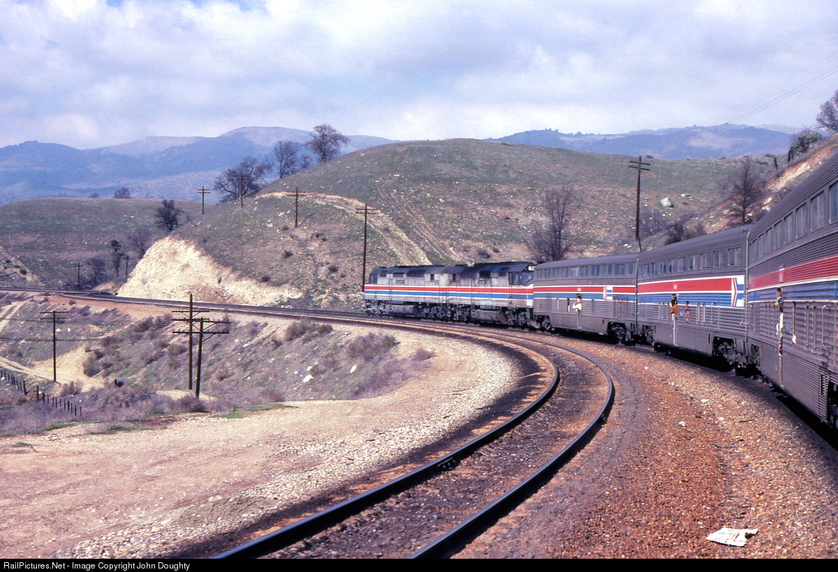 The 1979 Pacific Railroad Society "Mountain Outin" passenger special, with Amtrak SDP40F AMTK 518 and AMTK 517, is rolling westbound towards Bakersfield through Cable. Railfans occupying vestibules and baggage doors have cameras ready for the next of many uphill freight we would pass as we slowly rolled down the mountain.