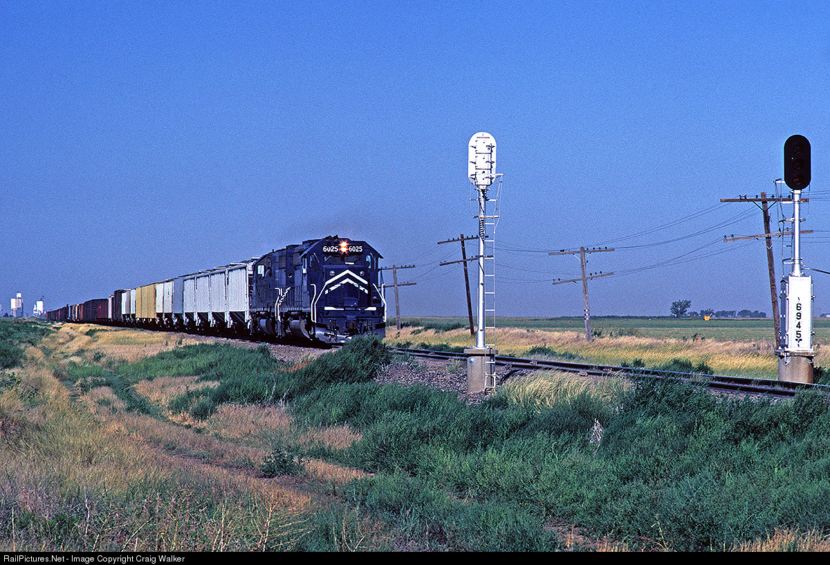 The American prairie is a vast, flat expanse. Heading east across these plains under a cloudless azure sky is a Missouri Pacific freight train, led by SD40-2s 6025 and 3202. The train is about to split the signals at milepost 694.5, just shy of two and a half miles from Modoc, Kansas, the towering grain elevators of which can be seen in the far distance in this August 22nd, 1980, morning.