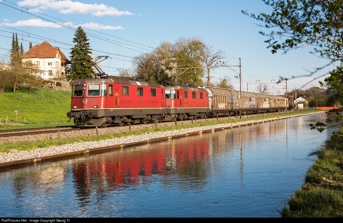| Re 4/4 II # 11263 and 11254 in multiple are pulling a freight along the fabric canal in Bürglen. |
