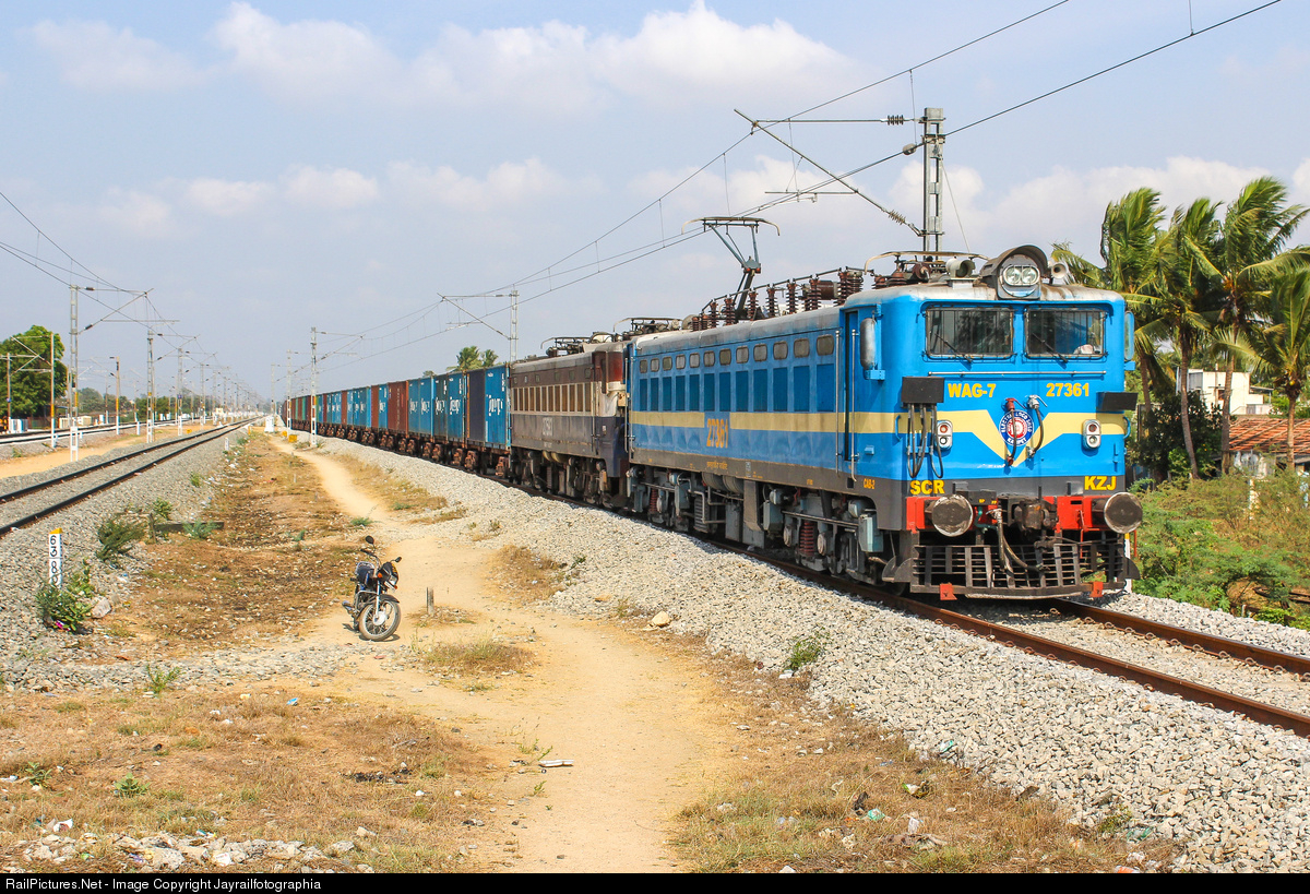 WAG-7 duo from KAZIPET shed with empty CONCOR bound for TONDIARPET freight yard passing Mosur