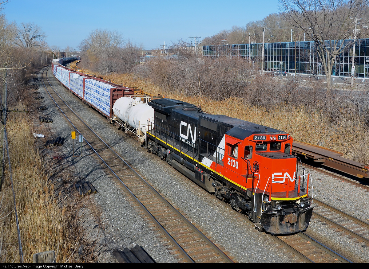 | A clean Dash8. Very clean standard cab CN 2130 is leading CN 324 eastwards on CN's Montreal sub on a beautiful spring morning. It is on its way to St. Albans, VT and interchange with the New England Central Railroad. |