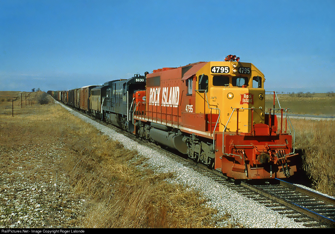 Rock Island freight with in the lead SD40-2 4795, the 2nd unit Southern Pacific GE U33C 8630 and a Rock Island F9Am 4168 ex UP 537 still in yellow near Saginaw, Texas February 1974.